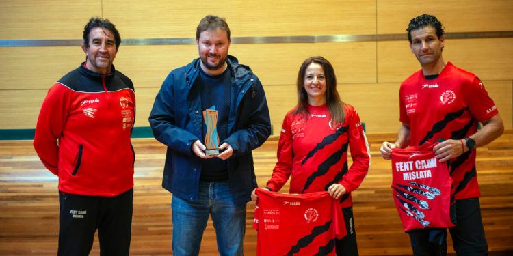 FOTONOTICIA: El diputado de Deportes de la Diputació de València, Andrés Campos, recibió este jueves, en la sede central de la corporación provincial, a los representantes del Club de Atletismo Fent Camí Mislata con motivo del gran éxito obtenido en el Campeonato de España Absoluto de Clubes en pista cubierta, que se celebró este fin de semana en Orense, y donde el equipo de l’Horta subió al tercer escalón del podio. Al encuentro han acudido la presidenta del club, Inmaculada Francisco, el director técnico, Miguel Pinar, y el tesorero de la entidad, Vicente Tortosa, que han ofrecido el trofeo al diputado.