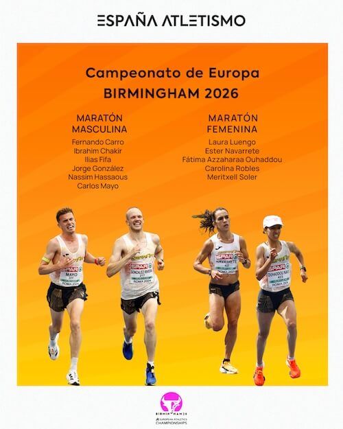 Laura Luengo, Ester Navarrete, Fátima Azzaharaa Ouhaddou, Carolina Robles y Meritxell Soler integran la preselección española de atletas para la prueba de maratón del campeonato de Europa de Birmingham, que se entre los próximos 10 y 16 de agosto. El equipo masculino lo componen Fernando Carro, Ibrahim Chakir, Ilias Fifa, Jorge González, Nassim Hassaous y Carlos Mayo. Ambas pruebas se disputarán el domingo 16 de agosto, con salida de los hombres a las 8:30h y de las mujeres a las 9:10h (hora española, una hora más que en Birmingham).