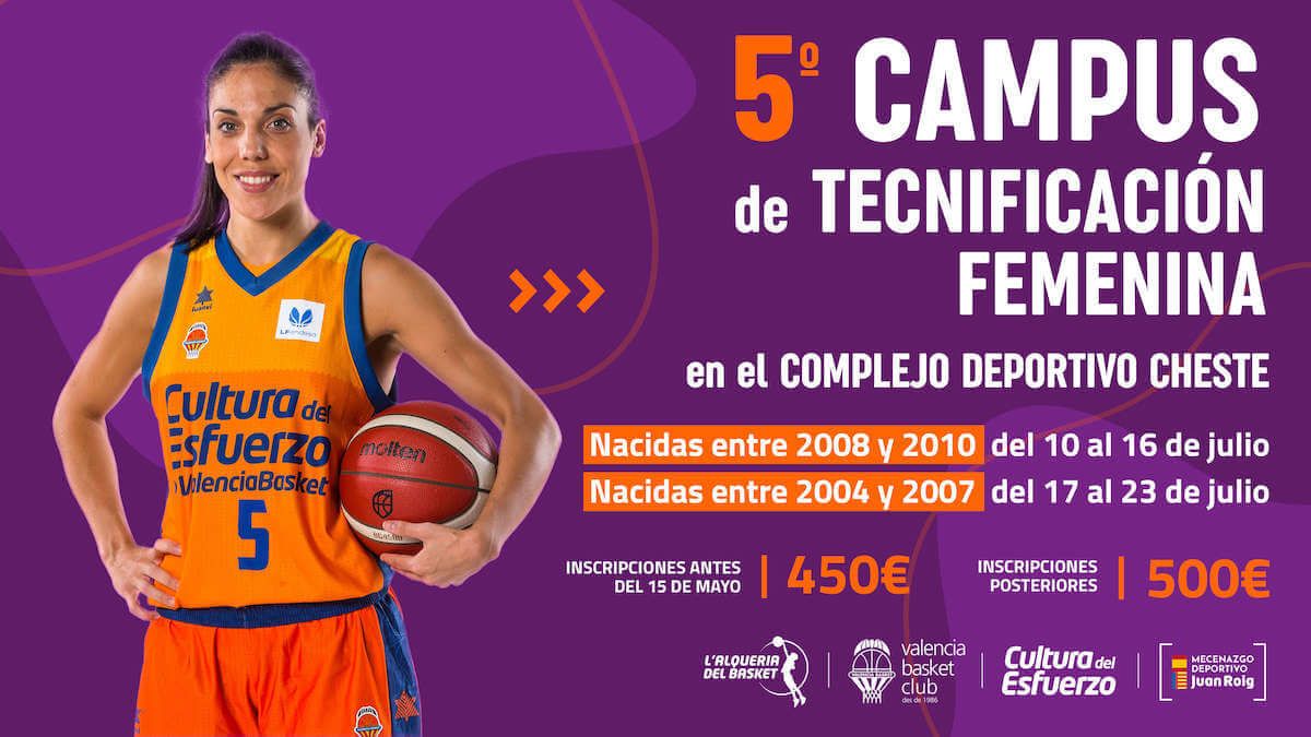 Valencia Basket abre el plazo para apuntarse al V Campus de Tecnificación Femenina, que se celebrará en el mes de julio en dos turnos. La actividad, que se llevará a cabo en el Complejo Deportivo de Cheste y en L’Alqueria del Basket, trabajará específicamente la técnica individual por fundamentos en grupos reducidos de 6-8 jugadoras y la táctica individual por estaciones en grupos de 10-12 jugadoras.