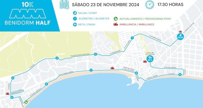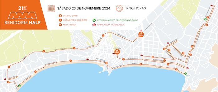 Teniendo como referencia la edición de 2023, la distancia 10K continuará con el mismo trazado mientras que en el caso de la Media Maratón contará con alguna mejora. Ejemplo de ello es que pasará la 21K por la avenida del Mediterráneo en el kilómetro 10,5 en lugar del 18, de modo que tras superar la calle Gerona, que cuenta con la mayor animación de Benidorm, insuflando aliento a los corredores, llegará directamente a meta. Además, destaca la amplitud de la salida, en la que presumiblemente habrá en esta ocasión 6.500 runners. A lo largo del trazado, la Benidorm Half pasará por las playas de Levante y de Poniente, o por el casco antiguo, acabando en ambos casos en la plaza del Ayuntamiento de Benidorm.