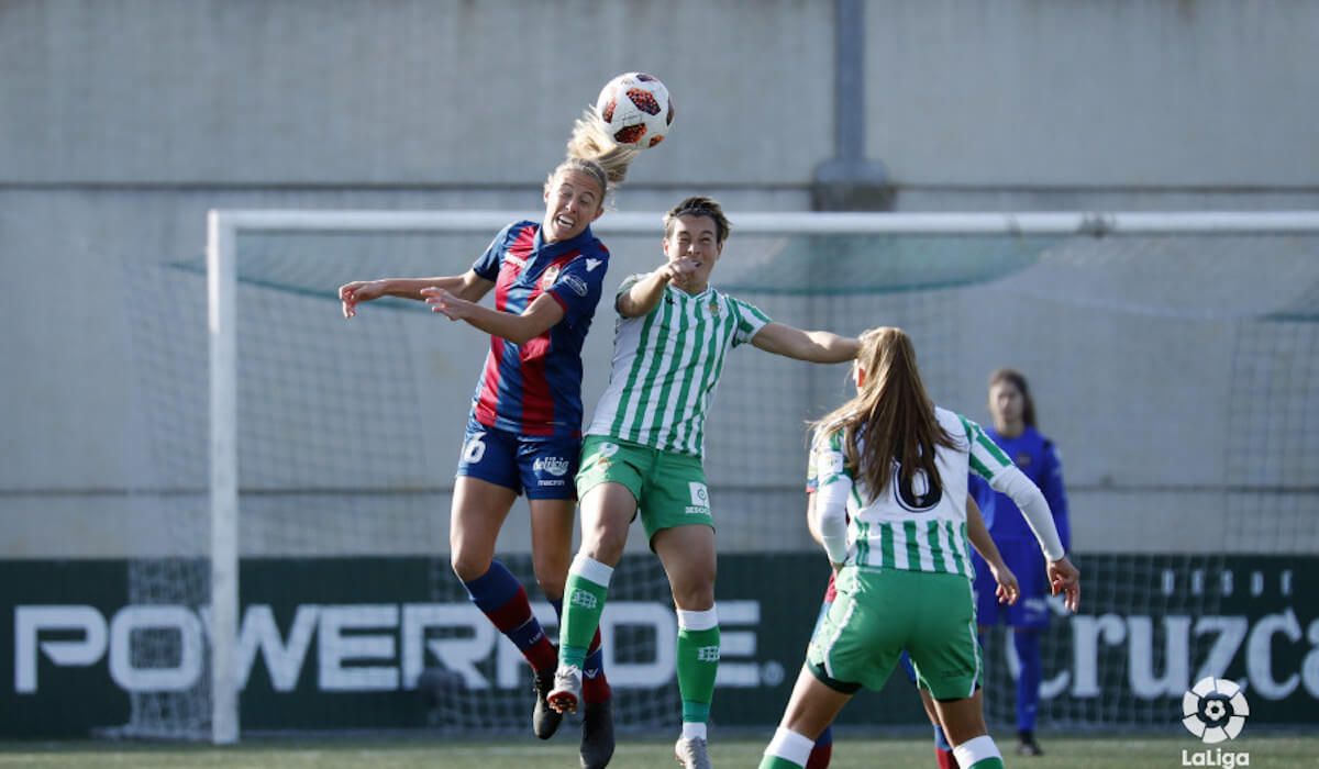 Se conjugó un primer tiempo igualado en líneas generales, aunque el Betis dibujó algunas líneas de relativa superioridad ante el conjunto levantinista. Pasados unos primeros momentos de encuentro de puja por la posesión del balón, sin que un equipo lograra minimizar al otro, y lógicamente sin que faltara intensidad en cada acción, las andaluzas consiguieron proyectar varios momentos de mayor rango incisivo en su ofensiva. Tres intentos acumuló en sus tentativas sobre la portería de Sandra Torres, si bien el chut cruzado de Bea Parra desde la frontal del área levantinista el que estuvo más cerca de cambiar el marcador. Poco más que eso, pues el Levante, en todo caso, formuló también un primer acto serio entre dos equipos instalados en la zona noble de la clasificación. Justo fue el empate al descanso.