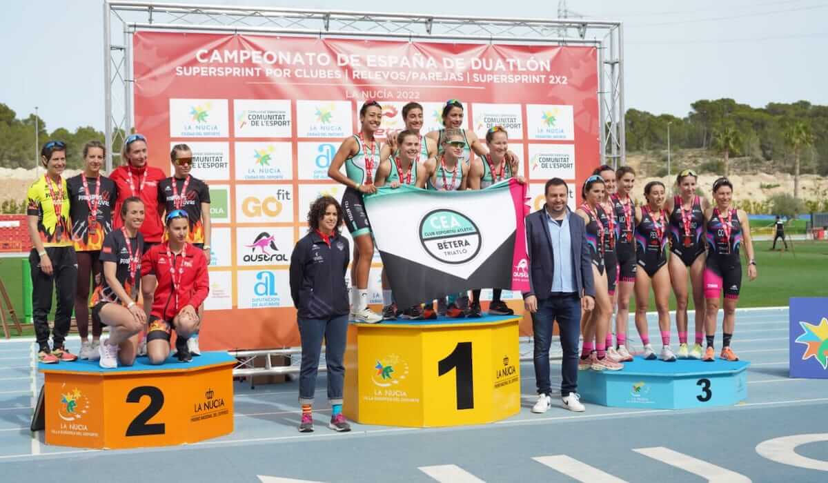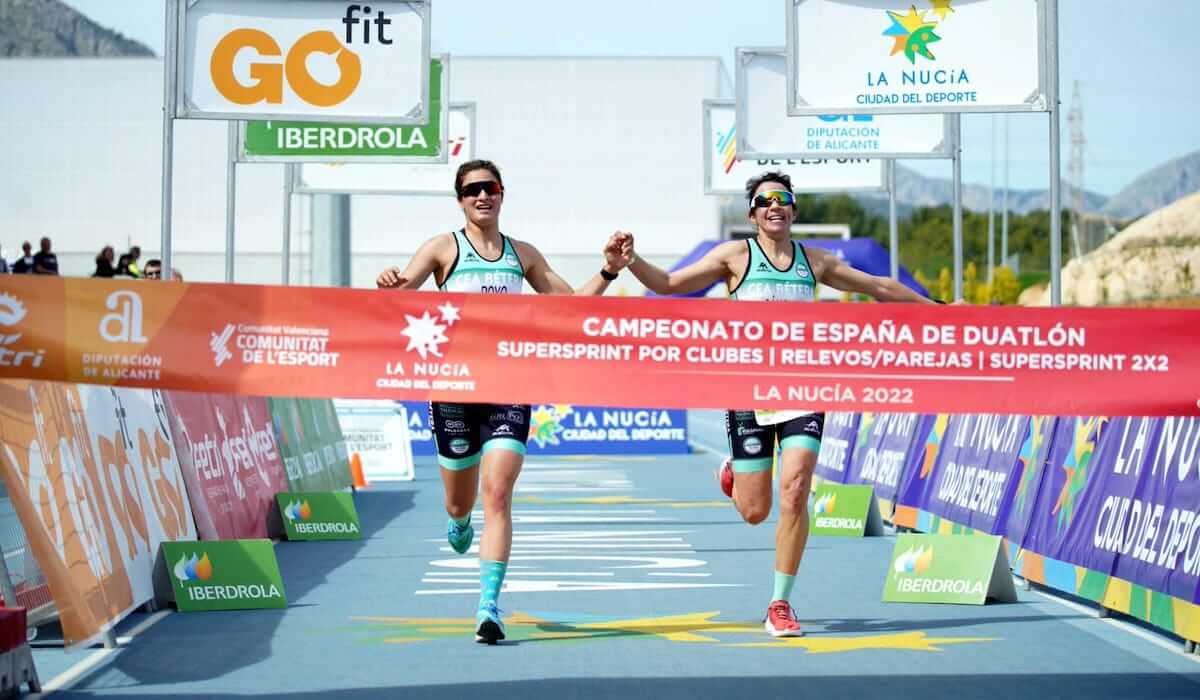 La Liga Nacional de Clubes de Duatlón comenzó en “La Nucía Ciudad del Deporte” con tres apasionantes jornadas que han dejado un club triunfador muy claro en la Primera División Femenina, el conjunto valenciano del CEA Bétera que se impuso en las tres, consiguiendo tres títulos. El último fue el de la mañana del domingo, en la carrera de SuperSprint por Clubes 2×2, en las que alcanzaban el oro igual que habían hecho el sábado en las competiciones nacionales de SuperSprint por Clubes y de Relevos Parejas. Nada que ver con la categoría masculina, en la que cada jornada de Primera tuvo un club diferente como campeón, anotándose el título de SuperSprint por Clubes 2×2 el Alusigma Peñota Dental Portugalekoa. Las pruebas, organizadas por la Federación Española de Triatlón con la colaboración del Ayuntamiento de La Nucía, la Diputación de Alicante y la Fundación Trinidad Alfonso, dentro del Programa de Apoyo a Competiciones en la Comunidad Valenciana (PAC CV), tuvieron como centro principal el Estadi Olimpic Camilo Cano, con mucho público en la grada.
