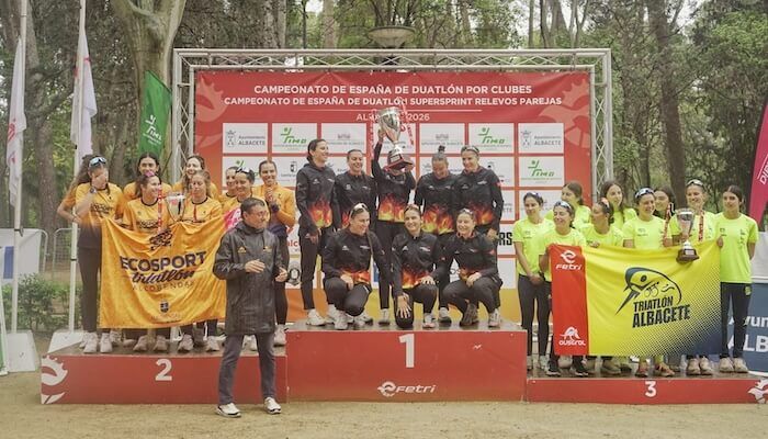 El Triatlón Albacete Res se impuso en la última jornada de la Liga Nacional de Clubes de Duatlón 2026 ante su afición, ganando el Campeonato de España de Duatlón Relevos/Parejas con un tiempo de 1:06:10, alineando a Eva Fresneda Tortosa y Ángela Ojeda Tebar; Elena Romero Gómez e Irene Ruiz González; y Miriam Andreu Díaz y Eva María Sánchez Castro. En segundo lugar, con un tiempo de 1:06:19, finalizaban las campeonas de Liga, con Paula Del Pozo Borrachero y Carla Martínez González; María Tenorio Albo y Julia Tenorio Albo; y Alejandra Del Val Donderis y Lydia Castelló Blasco. El bronce fue para Ecosport Alccobendas, con Marta Cabello Arias y Tania Álvarez Gómez; Abigail Louise Baines y Sheila Álvarez Gómez; y María Vilas Vidal y Laura Durán Cabanillas, quienes terminaron con un tiempo de 1:06:23.