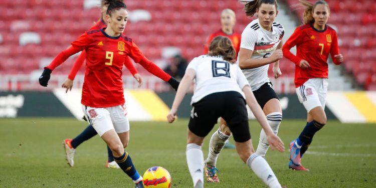 FOTONOTICIA: La selección española absoluta femenina de fútbol cedió un empate ante una mermada Alemania en el partido de la jornada 1 de la Arnold Clark Cup. España dominó en la mayor parte de las fases del partido en control de balón ante un combinado con muchas bajas por lesión y un brote Covid. Alexia Putellas puso por delante en el marcador a las españolas, pero a tres minutos del final del encuentro Schüller logró el empate (1-1).