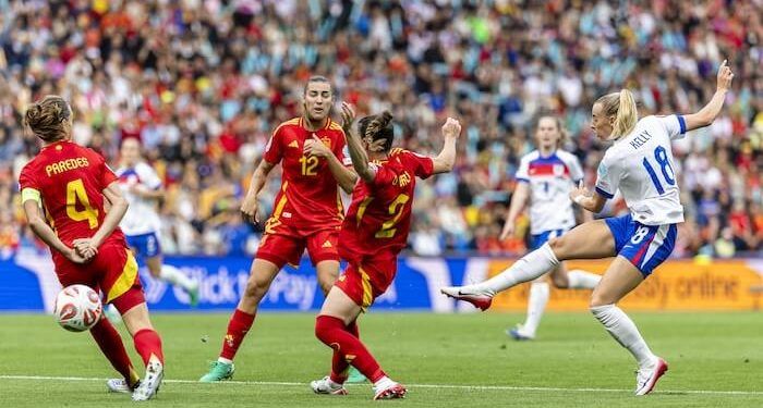 Inglaterra dijo poco. Nada prácticamente. Insulsa en todos los sentidos -lo dicho, especialmente en lo ofensivo-, la selección de Sarina Wiegman. Las españolas no tuvieron más que aprovechar los desajustes y falta de concentración de las británicas para acabar encontrando caminos hacia portería de Hampton. Mediado el primer periodo, una asociación española por la derecha y la conexión de Aitana en banda, que encontró a Athenea en la frontal del área, quien vio el pase interior hacia Ona, y ésta centró para el remate de cabeza de Mariona, que logró el 0-1. En adelante, se mantuvo el dominio de España, si bien la portera británica no acabó de tener apuros entre palos. Las inglesas no ofrecían en ataque más que bísqueda hacia su referencia, Russo, dado que Lauren James, que había formado en el once inicial pese a las molestias que arrastraba, no ofreció nada. La sensación era que Inglaterra jugaba con una futbolista menos. A cuatro del descanso, Chloe Kelly entró por James, aparentemente lesionada.