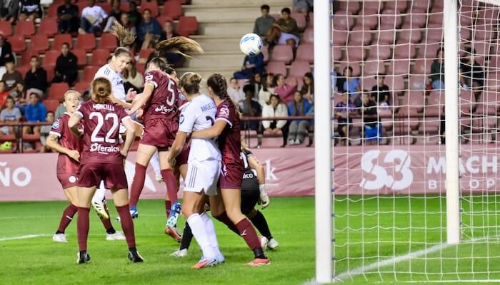 Pero justo después de la media hora el Real Madrid dio el primer golpe al partido, casi de forma inesperada, en un disparo de Athenea que rebotó en María Méndez y descolocó a la portera del Dux, que solo pudo ver cómo se colaba en su portería.