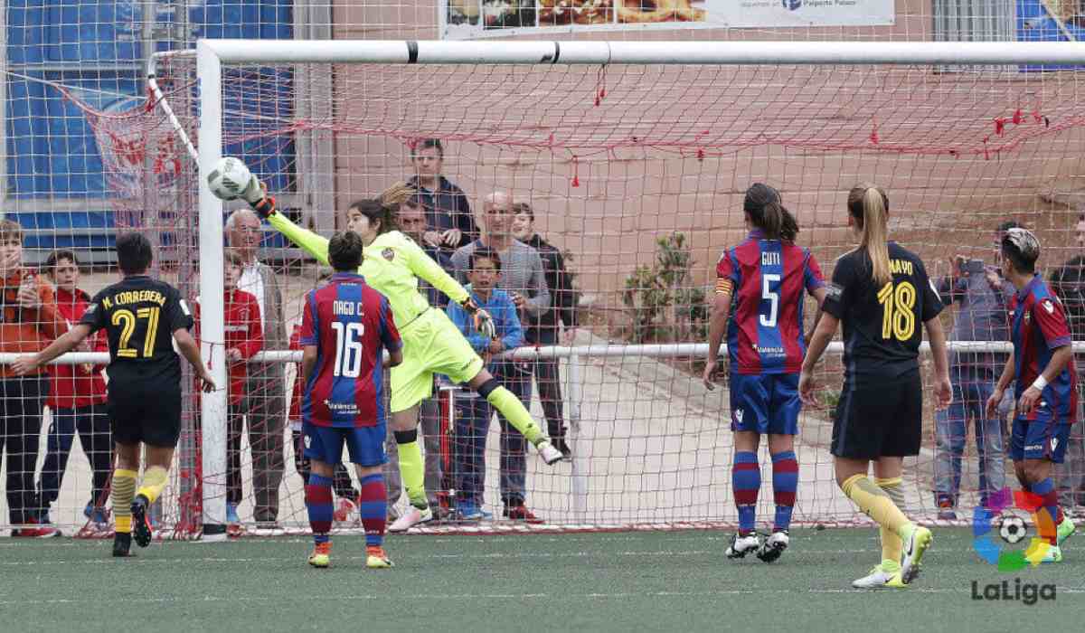 El Levante, zarandeado la jornada anterior por el Valencia en Mestalla, apareció con un planteamiento defensivo de Andrés Tudela. Estuvieron serias en esto sus futbolistas, aunque el Atlético cogió la espalda de las centrales en alguna expresión veloz en ataque. De hecho, de una de estas llegó la expulsión de Sonia Prim en los últimos minutos del primer acto. Falta de la última defensa local al borde del área sobre Sonia. El lanzamiento no tuvo incidencia. Y en ataque, la propuesta azulgrana fue escasa y tímida, casi inexistente. La herramienta siempre es el balón en largo a Marijose y Charlyn.
