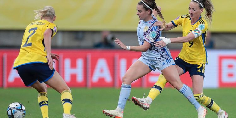 Procuró ser protagonista con el balón España, aunque sin poder tener la profundidad que hubieran querido y que precisamente exhibieron en el Mundial. En ese campeonato del Mundo, que a la postre ganaron, uno de los combinados más potentes precisamente fue Suecia, poniendo en valor su capacidad física y sacando en provecho especialmente de las acciones a balón parado. Precisamente en el servicio de un saque de esquina, Eriksoon puso por delante a Suecia mediada la primera parte. Se tuvo que sobreponer el conjunto español, que en el minuto 38 logró igualar con una diana de Athenea del Castillo, con un chut de fuera del área que trató de repeler Musovic, a quien se le escapó el rebote hacia adentro de su portería.