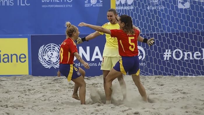 A falta de cinco minutos para acabar este periodo llegó el 1-0 anotado en propia meta por la portera Karolina Palacios, pero es que a falta de un minuto España consiguió el 2-0 por medio de la guardameta Laia García, una de las promesas del fútbol playa nacional y que milita en el Atlético Torroxeño, el nuevo campeón de Liga.