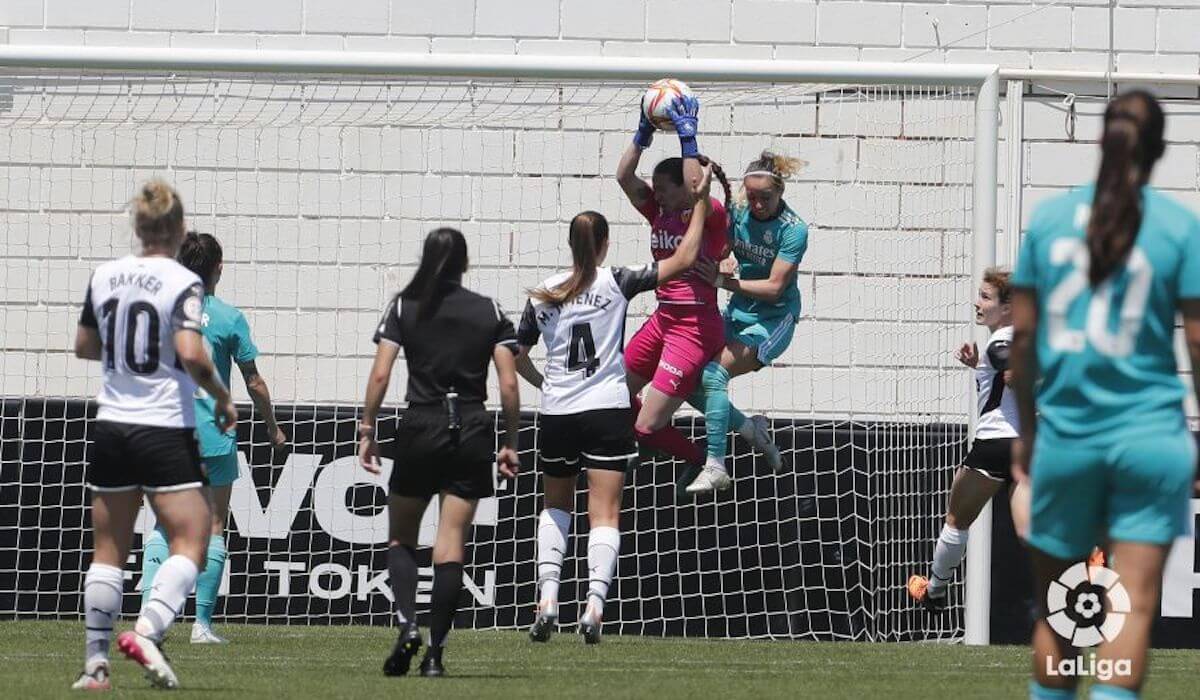 En el otro lado del campo, las protagonistas prácticamente eran las mismas. En el Valencia Enith seguía siendo salvadora con su guardia pretoriana. Y en el Madrid la llegada por los costados con Athenea y Olga o las tentativas de Esther se conjugaban en acciones de peligro. Un chut de la delantera internacional, de hecho, obligó a una mano genial de Enith que respaldada por el larguero evitó el gol madridista. También Marta Carro bloqueó una finalización de Esther. Y es que llegaba información desde Madrid con la victoria holgada del Atlético ante el Eibar: positivo para los intereses del Valencia y negativo para los del Real Madrid. El tramo final fue claro con un equipo blanquinegro gestionando bien su plan defensivo y un conjunto madrileño con el balón, con la persistencia, pero sin acabar de dar con la tecla para marcar.