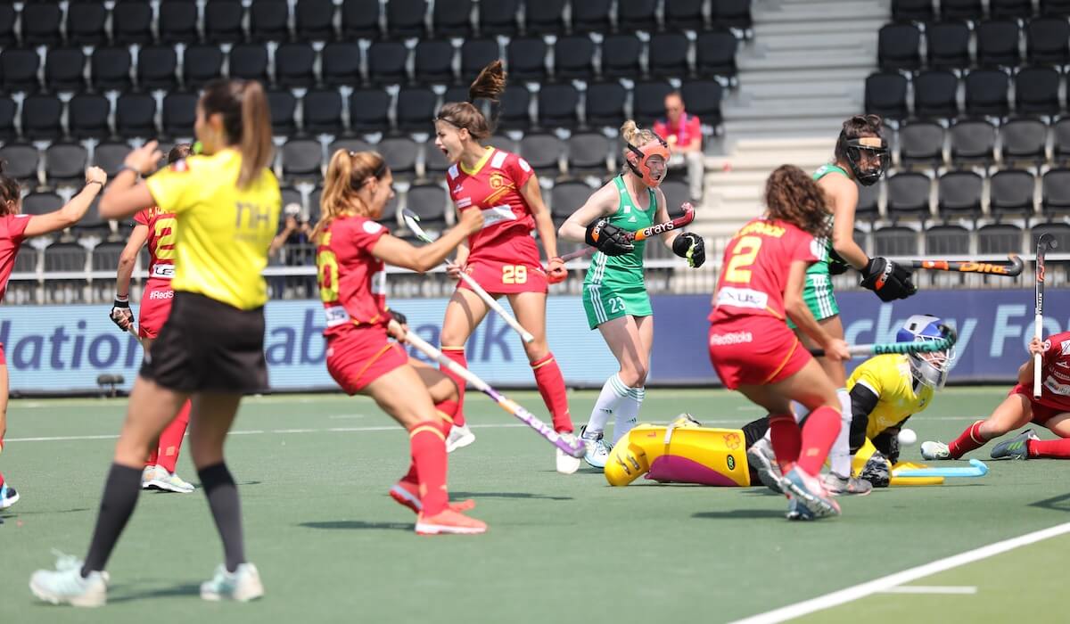 A las españolas les valía la igualada o el triunfo para obtener este objetivo. Sin embargo, en la primera ocasión generada, un penalti córner era materializado por Upton a favor de Irlanda, después de un lanzamiento directo (1-0, Minuto 2). España reaccionaría rápido, con un par de acciones, que solo la falta de precisión en el remate, pudieron evitar el tanto del empate. Sin embargo, con el primer penalti a favor de las españolas, la pizarra de Adrian Lock se puso en funcionamiento, para después de varias combinaciones, Begoña García mandar la bola al fondo de la portería (1-1, Minuto 12).