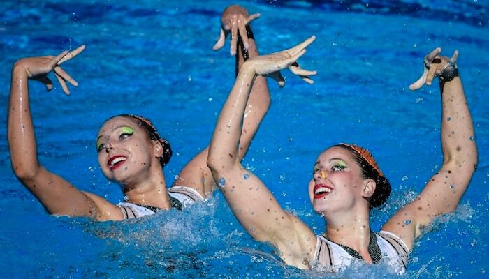 Francia, con El Bolero de Ravel, arrancó la competición en la piscina del Centro Acuático con su dueto formado por Anastasia Bayandina y Romane Lunel, que tuvo una valoración de 189.0687 en su propuesta de rutina libre, que sumado a la técnica del viernes acumulaba 430.3803. Las neocelandesas Rayna Buckle y Kiera Gazzard no acabaron de emocionar al público. Ya llegaron con la evaluación más baja de la técnica. La nota de los jueces fue de 166.5105 (354.6006). Momento para las australianas, con la española Paula Klamburg como entrenadora del equipo nacional, y el apoyo también técnico de Alba Cabello. Su rutina libre tuvo un fondo asiático con el tema Kung Fu Panda. Una valoración de 198.0271 (408.1053). Llegó Egipto con el Dúo integrado por Nadine Barsoum y Hana Hiekal: 225.6541 (422.1791). En ese momento, seguía al frente Francia.