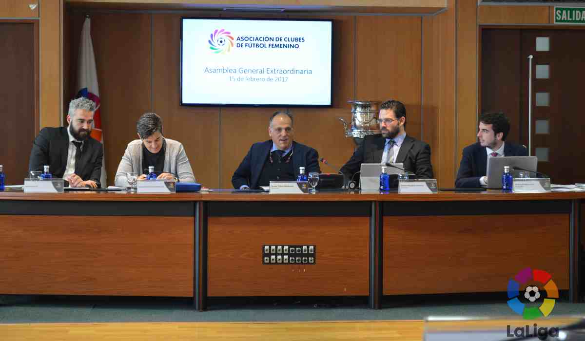 La Asamblea General Extraordinaria de la Asociación de Clubes de Fútbol Femenino se celebró este miércoles en la sede de LaLiga en Madrid. La reunión congregó al presidente de LaLiga, Javier Tebas; a su homólogo de la asociación y director del Área de fútbol femenino, Pedro Malabia; así como los presidentes de los 27 clubes que componen la asociación, a excepción del SD Eibar y la UD Collerense, que delegaron su voto. Además, acudieron como invitados el FC Barcelona, la Real Sociedad y el Athletic Club.