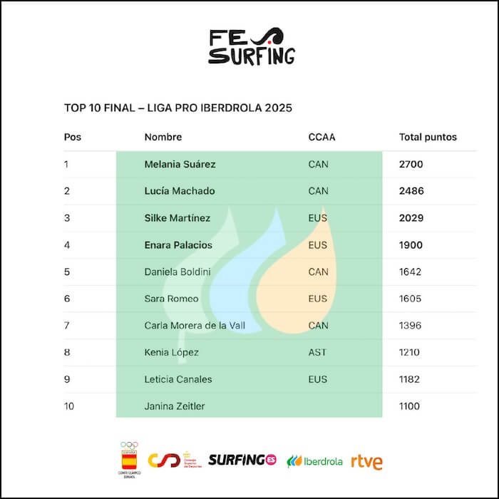 Lucía Machado (2486 pts), Silke Martínez (2029 pts) y Enara Palacios (1900 pts) completan el podio final de una edición que ha vuelto a evidenciar el potencial y la calidad del surf femenino español.