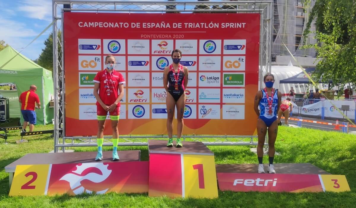 Anna Godoy, representando al Cidade de Lugo Fluvial, marcó el mejor tiempo en carrera con 1:00:12. Xisca Tous, estrenando tritraje del Isbilya Sloppy Joe’s, conseguía la plata con 1:01:16, y Miriam Casillas, con la uniformidad del Triatlón Ferrol, lograba la medalla de bronce con un tiempo de 1:01:40, seis segundos menos que Noelia Juan, del CEA Bétera.