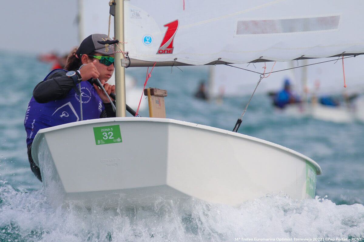 El Trofeo Euromarina Optimist Torrevieja cierra la primera de las cuatro jornadas previstas, y lo hace cumpliendo con el programa de tres pruebas, merced a las buenas condiciones de viento, aunque tras cerrarse la primera prueba, con viento del 340º, rolaba a la derecha hasta irse a un 040º y pasando de 8 a los 12 nudos de intensidad.