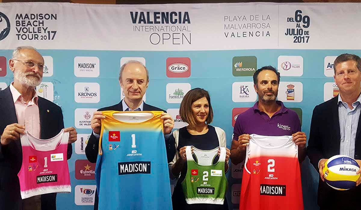 Valencia albergará la segunda prueba del torneo Madison Beach Volley Tour 2017 este próximo fin de semana con la participación de 96 jugadores de vóley playa. La cita, que se disputará sobre la arena de la playa de La Malvarrosa, se presentó este jueves en la sede de la Fundación Deportiva Municipal de la ciudad del Turia con la presencia de la concejala delegada de Deportes del Ayuntamiento de Valencia, Maite Girau; el presidente de la Real Federación Española de Voleibol, Agustín Martín; su homólogo en la Comunidad Valenciana, Arturo Ruiz; y el presidente de Madison Sport Marketing, Luis García; así como el jugador Javier Gómez Ojeda.